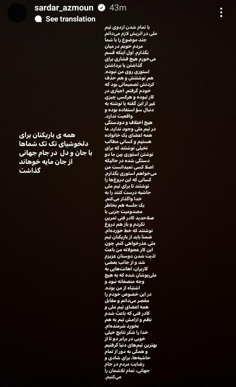 "با تمام شدن اردوی تیم ملی در اتریش لازم میدانم چند موضوع را با شما مردم خوبم در میان بگذارم. اول اینکه قسم میخورم هیچ فشاری برای گذاشتن یا برداشتن استوری روی من نبوده.