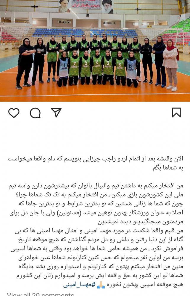 سردار ازمون همچنین در پستی اینستاگرامی از زنان ورزشکار تقدیر کرد و ابراز تاسف خود را نسبت به حوادث اخیر کشور به خصوص فوت مهسا امینی نشان داد.