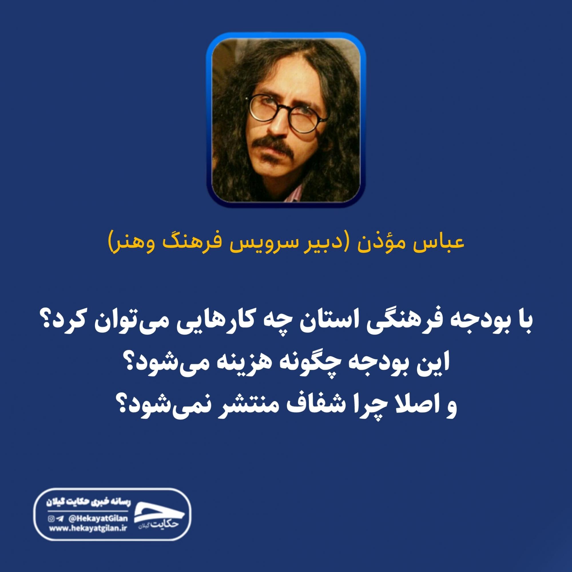 حکایت گیلان | سرویس فرهنگ و هنر | عباس موذن: بودجه استان گیلان در سال ۱۴۰۳ برابر ۱۸،۶۱۴،۵۵۸ میلیون ریال است که ۶۰ درصد آن یعنی مبلغ ۱۱،۱۶۸،۷۳۴.۸ میلیون ریال بودجه شرکتها و بانکهای دولتی ست که طبق آئین نامه باید ۱ درصد آن یعنی ۱،۱۱۶،۸۷۳.۴ میلیون ریال (صد و یازده میلیارد و ششصد و هشتاد و هفت میلیون و سیصد و چهل و هشت هزار تومان) با صلاحدید وزارت ارشاد در بخش فرهنگ هنر هزینه شود.