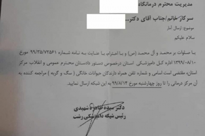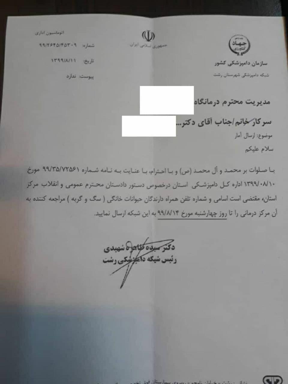 حکایت گیلان | به دنبال انتشار تصویر نامه ای از سازمان دامپزشکی استان گیلان خطاب به کلینیکهای دامپزشکی مبنی بر ارائه شمارهی کسانی که حیوان خانگی دارند، «مصطفی اکبرپور» رئیس دفتر ریاست سازمان دامپزشکی در گفت وگویی گفت: بنده مشخصاً درباره این نامه اطلاعی ندارم اما به طور کلی در کلینیک های دامپزشکی سراسر کشور پرونده های حیوانات خانگی به صورت اطلاعات پزشکی یا نسخه نویسی آن حیوان موجود است تا در صورت لزوم همه دامپزشکی های سراسر کشور به اطلاعات حیوان خانگی جهت درمان و رسیدگی، دسترسی داشته باشند.
