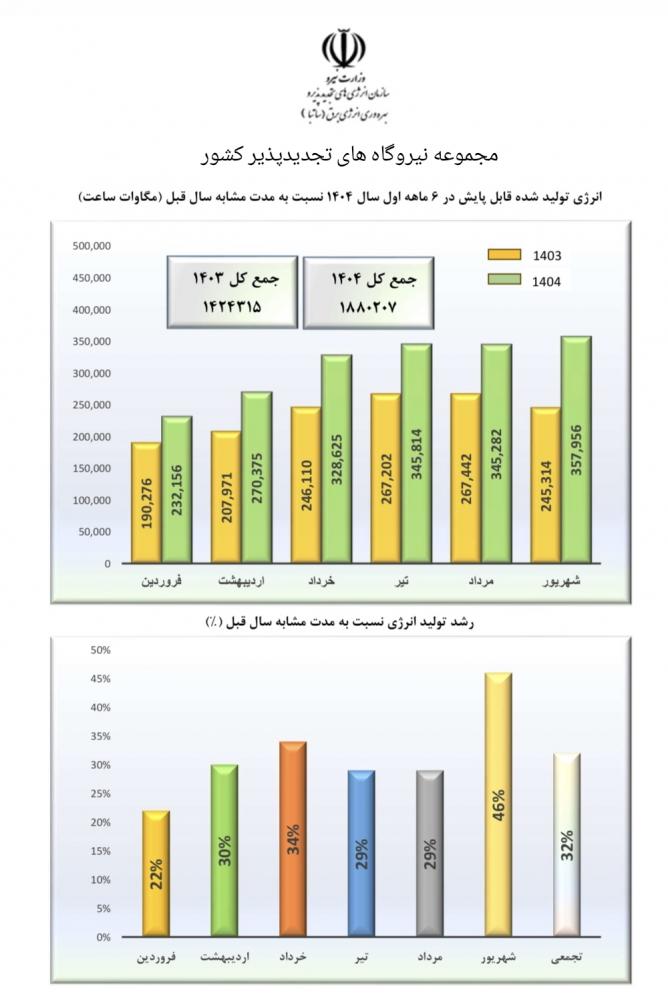 مستند به این گزارش ظرفیت منصوبه نیروگاههای تجدیدپذیر کشور نیز در پایان سال ۱۴۰۳ حدود ۱۶۱۰ مگاوات بوده که با بهرهبرداری از ۹۴۰ مگاوات نیروگاه خورشیدی جدید تا پایان مهرماه امسال به ۲۵۵۰ مگاوات افزایش یافته است. این رشد ۵۸ درصدی، بیانگر جهش قابل توجهی در توسعه انرژیهای پاک طی کمتر از یک سال است.